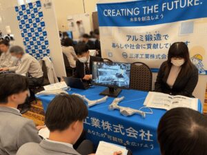 米沢市の企業76社、地元高校の生徒200名以上が集まった企業説明会で、弊社ブースでは、生産風景の動画や弊社アルミ鍛造製品を多くの方に見ていただきました。